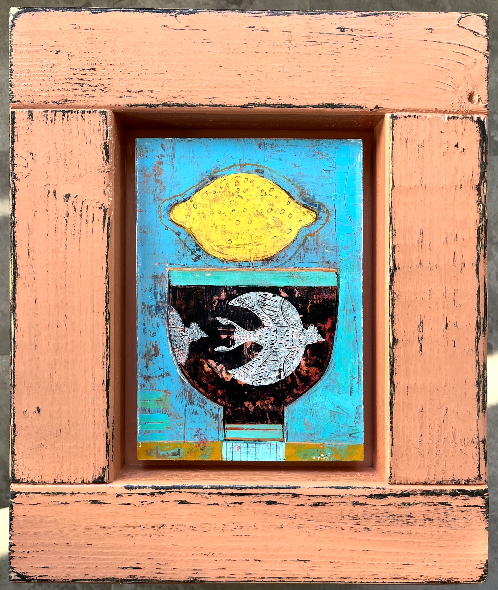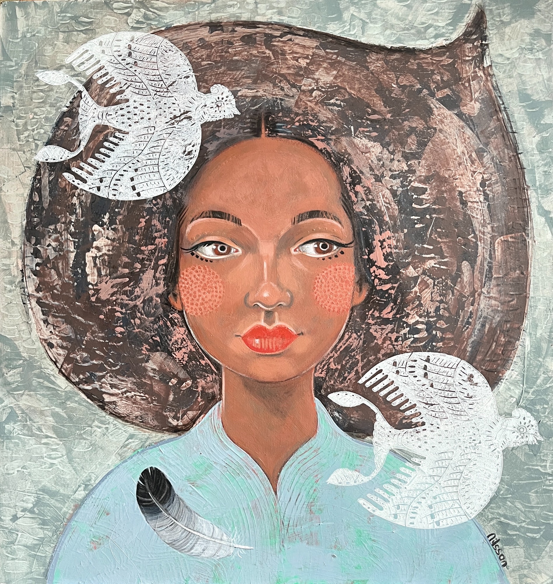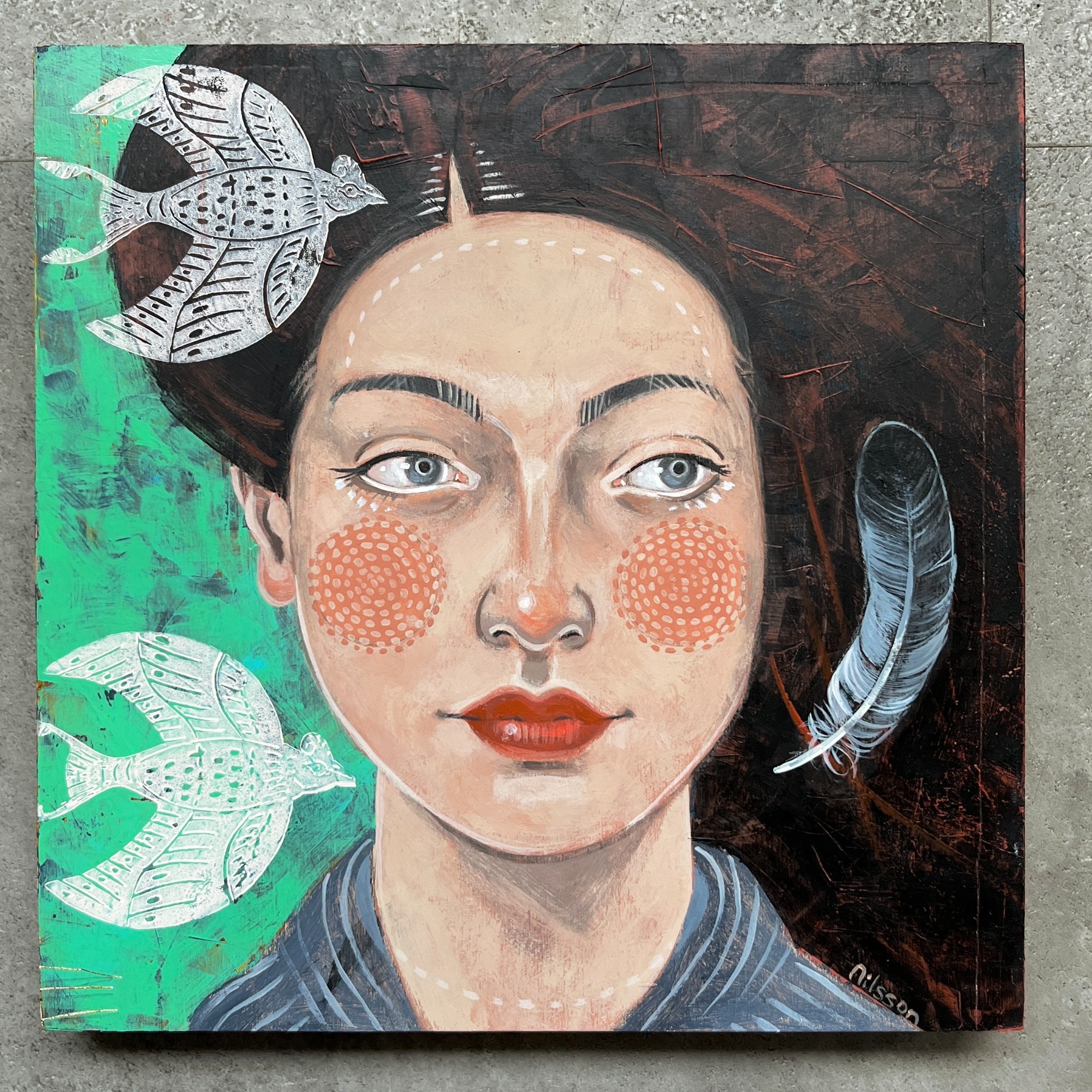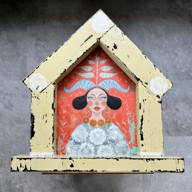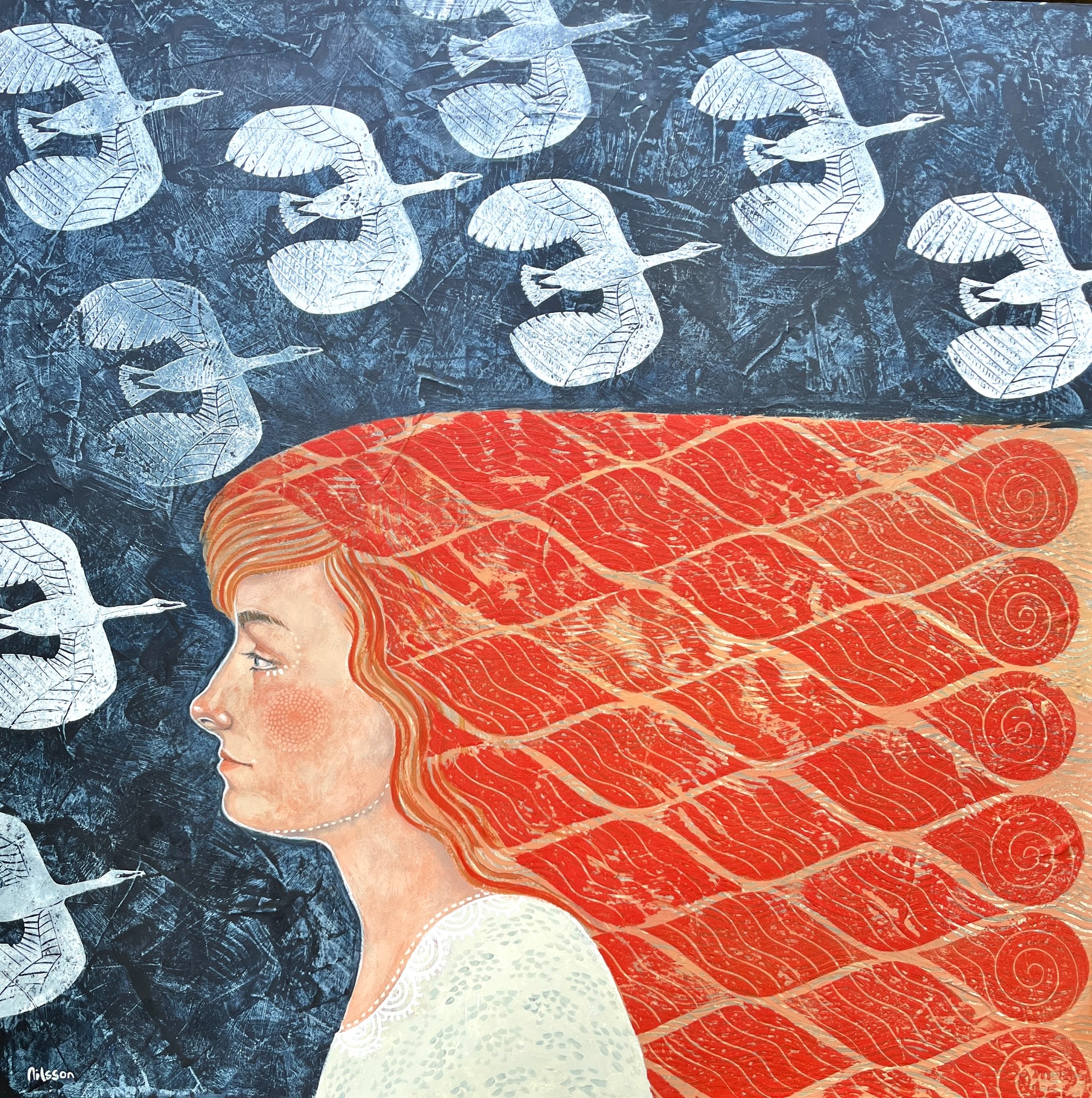 There has always been an element of pattern in my paintings, and for a long time I added this with potato print. Now I am working with lino a lot of the time, this has spilled into my paintings as well, and I'm using the same blocks as my prints as well as creating specific ones for each painting. My feisty ladies have always featured heavily, along with elements of myth and legend from all over the world, and motifs taken from the natural world. All my paintings are mixed media on board or wood, framed by my partner, Stuart in his amazing handmade frames.
