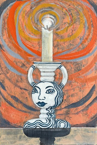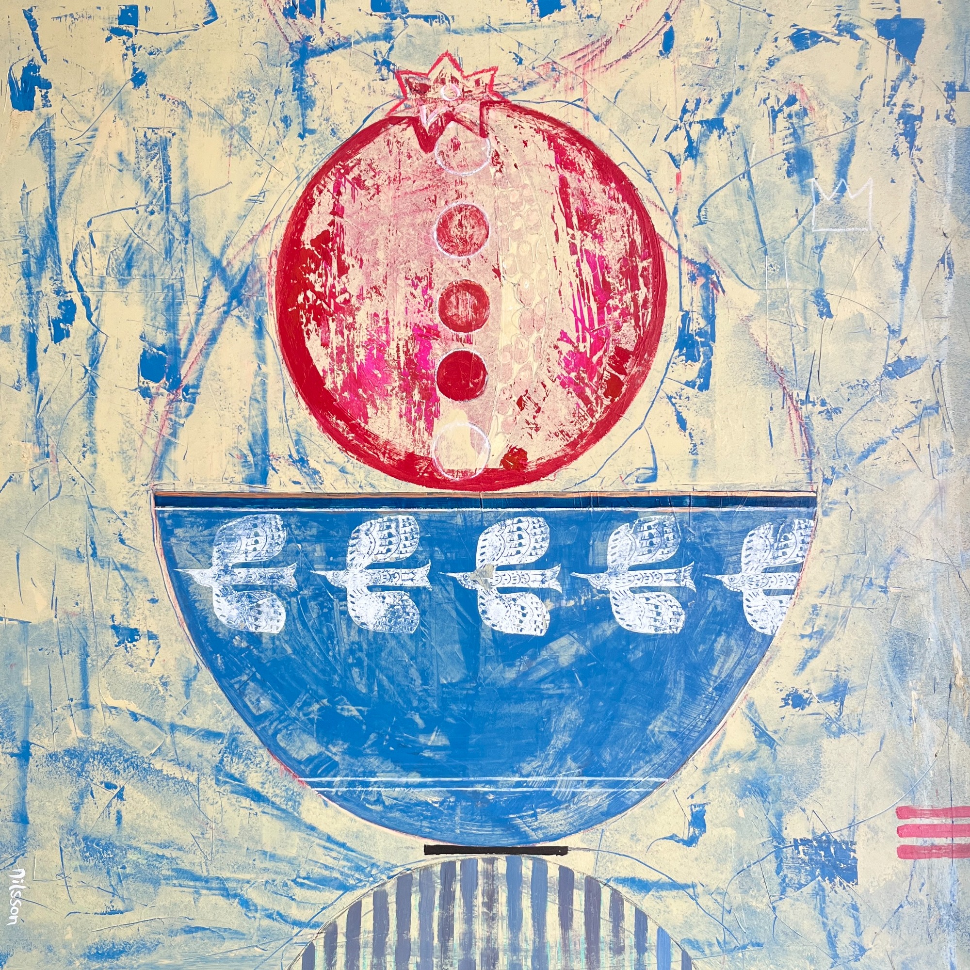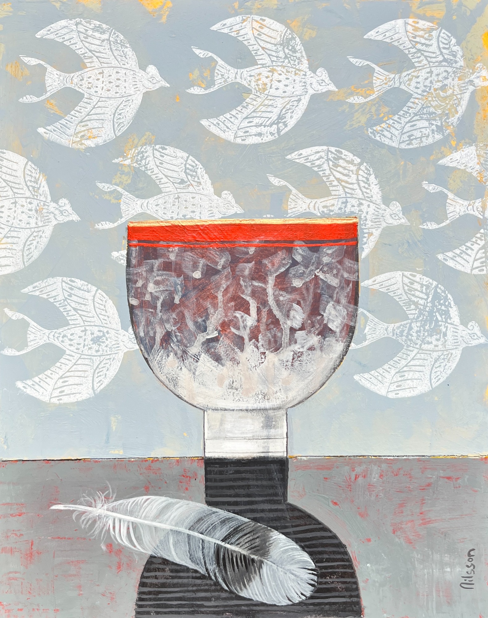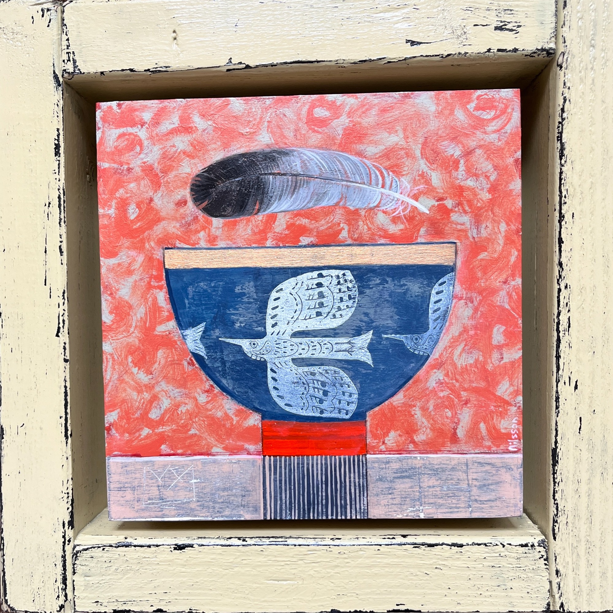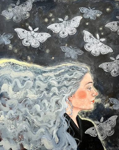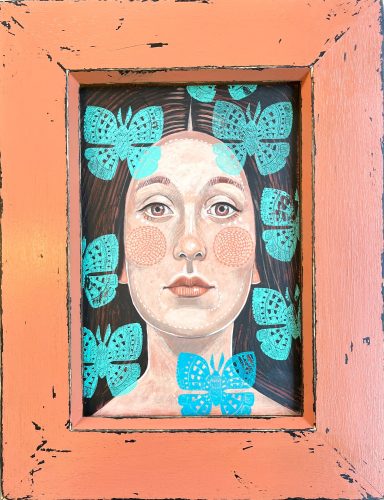 There has always been an element of pattern in my paintings, and for a long time I added this with potato print. Now I am working with lino a lot of the time, this has spilled into my paintings as well, and I'm using the same blocks as my prints as well as creating specific ones for each painting. My feisty ladies have always featured heavily, along with elements of myth and legend from all over the world, and motifs taken from the natural world. All my paintings are mixed media on board or wood, framed by my partner, Stuart in his amazing handmade frames.